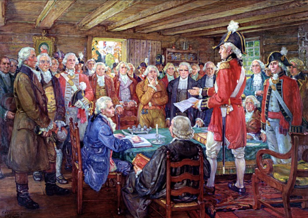 The officers – civil and military – merchants, traders and settlers, had gathered in crowds about the house on the river band, which was to receive the new parliament. Great numbers of the men had donned their old uniforms of the Rangers and other loyal corps in honour of the occasion. All were in their best holiday attire. The men in the fashion of the times – in long coats, vests, and knee breeches with long stockings or gaiters and boots, their hair in queues, surmounted by three-cornered hats, a fashion suited to brave men. The women’s dresses high-waisted, with tight sleeves, and bunched up behind over elaborate petticoats. Handsome women made any dress handsome.
