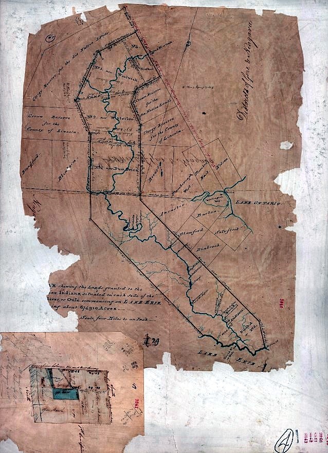 On February 5, 1798, the chief presented himself before the authorities and, through the good offices of government, formally transferred the lands already assigned to their several purchasers. Of approximately 570,000 acres that constituted the original Haldimand grant, approximately 350,000 were disposed of in the several conveyances that were formally sanctioned early in 1798 and parcelled out in six large but unequal blocks.