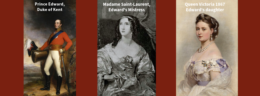 Madame Alphonsine-Therese-Bernardine-Julie de Montgenet de Saint-Laurent (1760-1830) was the wife of Baron de Fortisson, a colonel in the French service, and the mistress of Prince Edward. She was born in Besancon, France but her family later moved to Quebec. While in Geneva, the Duke had been introduced to the de Fortissons, and soon afterward Julie and Edward became lovers. His father, King George III, enrolled Edward in the army and had him posted to Gibraltar, where Edward made arrangements for her to be smuggled so that they could be together. George III later found out about the affair, and so sent the Duke to Quebec City as colonel of the 7th Fusiliers. Humiliated, he at first refused to go, but in August 1791 arrived accompanied by his chatelaine, introduced as Julie de Saint-Laurent and reputed to be a widow. It has been claimed by several writers that she was secretly married to Edward at a Roman Catholic church in Quebec.