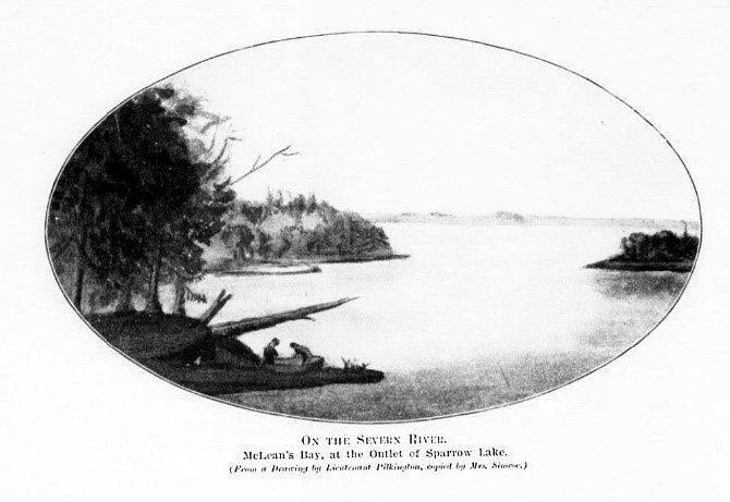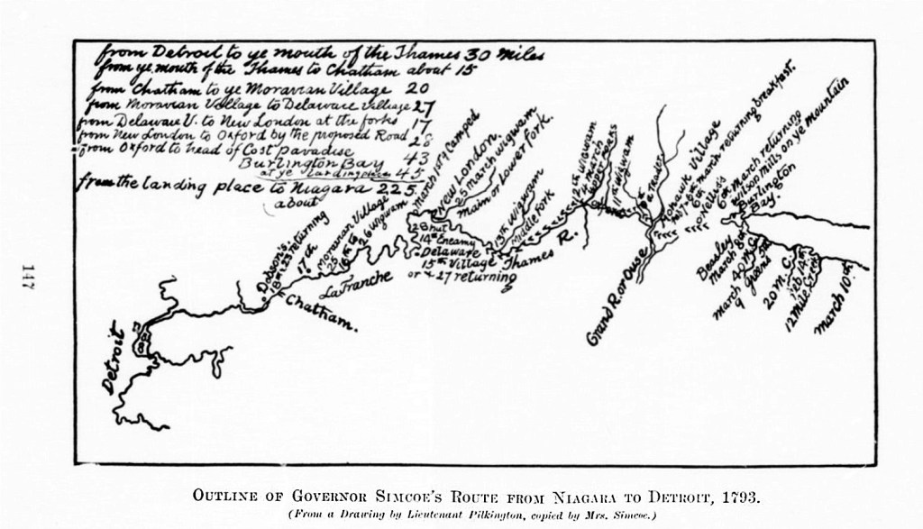 Pilkington also served the function of semi-official cartographer. In 1793, Simcoe forwarded the young engineer’s sketch-map of York harbour to George III, and four days later included him in the group travelling by canoe from Humber Bay on Lake Ontario to Georgian Bay. He drew maps of the waterways along the route and painted several scenes observed during the trip, most notably on the Severn River. In March 1794 Pilkington accompanied Simcoe to Detroit and to the Miamis (Maumee) River. He prepared an improved map of the western Lake Erie region and sketched the Miamis River area, where he also remained behind to rebuild Fort Miamis (Maumee, Ohio).