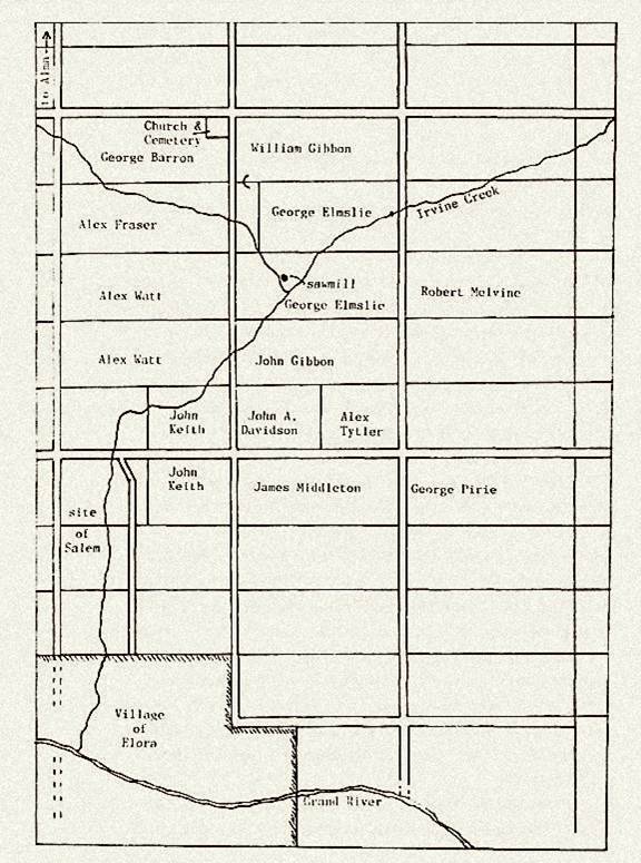 The first thing now necessary to be done was to make a practicable road into our new possessions; it, of course, could only be at first a ‘brush’ road. The parties who were engaged in making this first road to Bon accord were Messrs. Watt, John Keith, myself, William Gibbon, John Fergusson, and Sam Trenholme: the last two were the Engineers and Pioneers. We started from Elora immediately after breakfast, and taking the line between the eleventh and twelfth concessions, by four o’clock in the afternoon completed a very good ‘brush’ road to the Irvine, making the ford a little above the present bridge.