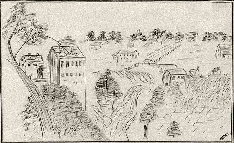As a matter of course, we went to the tavern, where were workmen in every part of it, fitting up, planing, plastering and chinking. We sauntered about, seeing the little that was to be seen, looking at the dam, the falls, the black pool under the rude half-finished bridge, and the stumps wherever there was any clearance, which was mostly confined to the village site; and the banks of the river, which appeared to us much less majestic than at Elora – although the lofty, precipitous, water worn, rocky banks attracted much of our attention. We then went to Mr. Webster’s, and saw the plan of his lands, but found that all the choicest situations, all the lots nearest Fergus, all the lots bordering on the rivers and streams, were already sold; and he had not a block left of any extent nearer than four or five miles from Fergus. On pointing out this to Mr. Webster, he then advised us to examine Mr. Gilkison’s land that, as far as he knew, very few lots of his had been sold, and we would therefore have the pick of the block and many choice sites on the Irvine and other streams. We then took our leave.