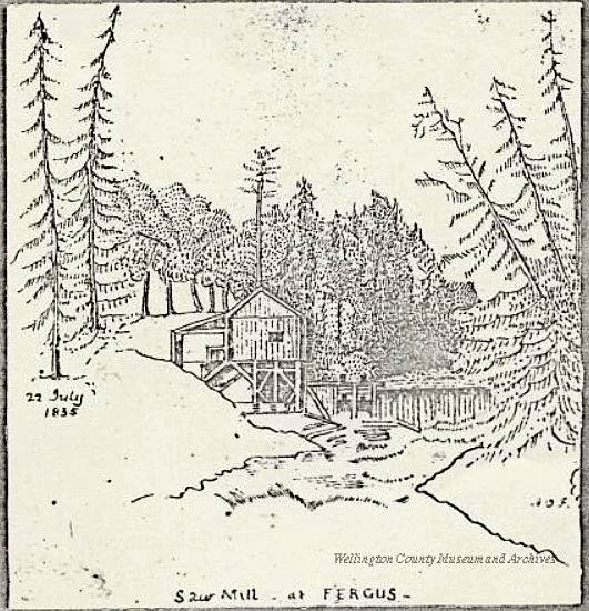 From the door of the store, we observed that a part of the opposite river bank was cleared, with a small shanty upon it – a saw mill – beneath which were “the Falls.” We also observed a bridge on a line with the store. We hastened down to the saw mill, which was not then working, being out of repair, and from beneath it got our first view of the Falls, which, notwithstanding our having so lately seen Niagara, appeared to us really magnificent and extremely picturesque. We then returned to our lodgings at Mr. Martin Martin’s. Next morning, finding that Mr. Gilkison had not returned, we resolved to visit Fergus.